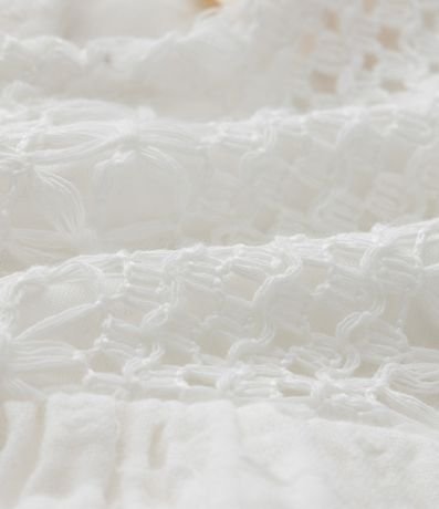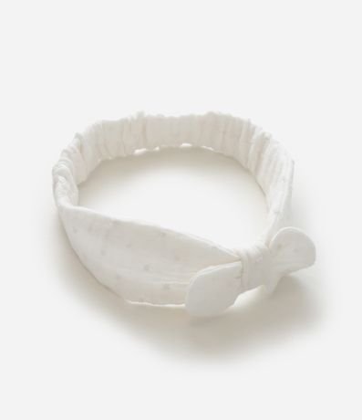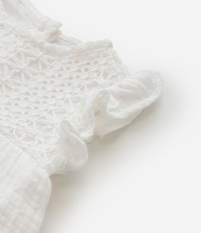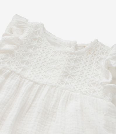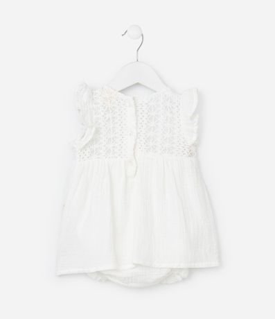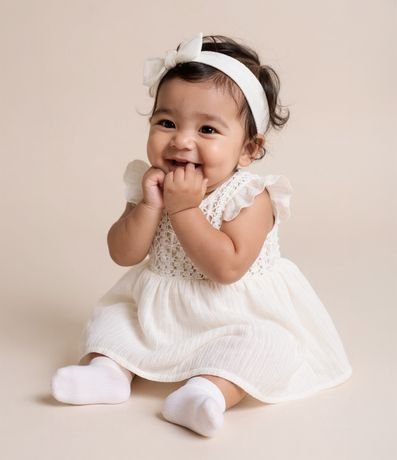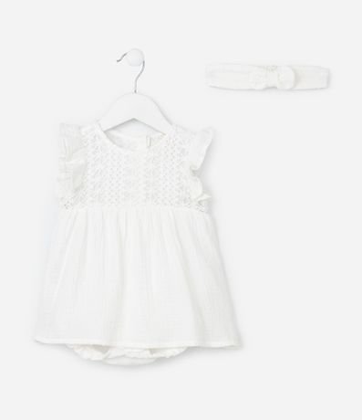 Ref: Vestido infantil para bebês confeccionado em tricoline, de material e processo mais sustentável. Com gola redonda, mangas com babadinhos, textura em rendinha no peito e fechamento no entrepernas. Acompanha faixa de cabelo.