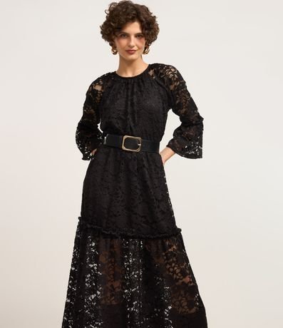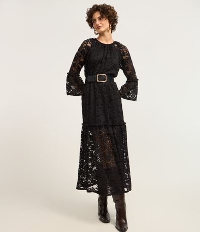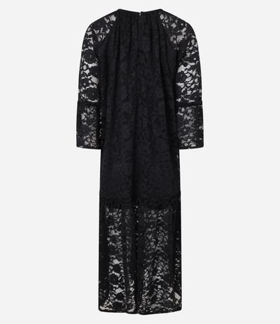 Vestido reto de comprimento alongado, incorporado na tendência Boho, confeccionado em renda através de boas práticas ambientais. A peça dispõe de gola redonda com fechamento em gota nas costas, punhos boca de sino além de mangas longas e barra com vazados transparentes.