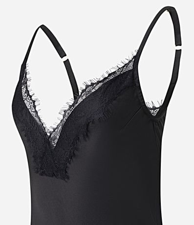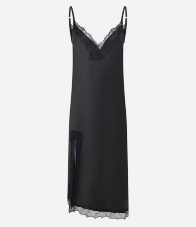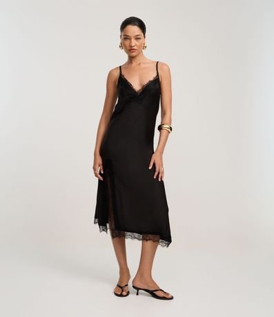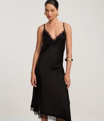 Ref: Vestido slip dress de alcinhas finas, confeccionado em tecido com efeito acetinado, com decote V e barra assimétrica. Roupa com rendas no decote e na barra. Peça incorporada na tendência Boho. Este produto possui fio reciclado em sua composição, além de ter sido produzido através de processos mais sustentáveis, sendo ambientalmente mais responsável.