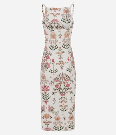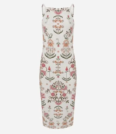 Vestido Canelado com Decote Quadrado e Estampa de Arabesco