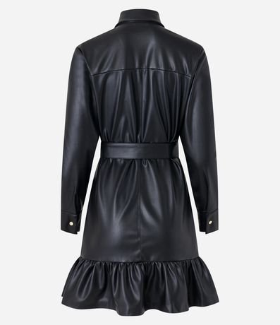 Vestido feminino, confeccionado em PU, com mangas longas, abotoamento frontal e gola lapela. A peça também conta com cinto fivela para ajuste na cintura.