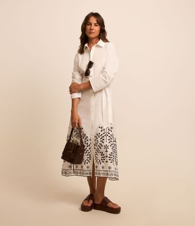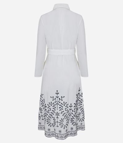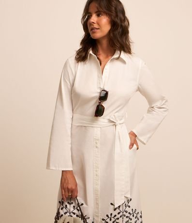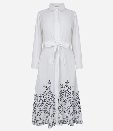 Ref: Vestido chemise, midi e evasê com manga longa, abotoamento frontal, amarração na cintura e barrado de richilieu.