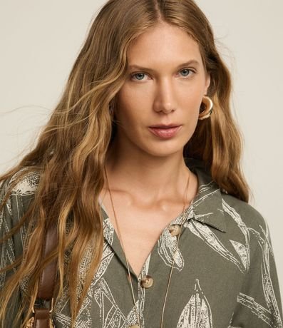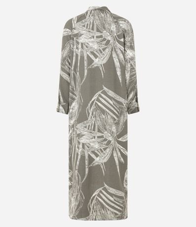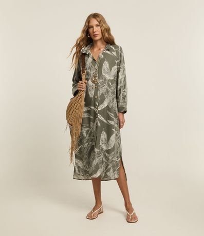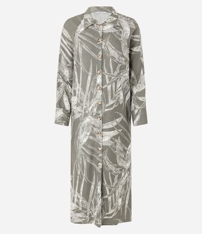 Vestido Chemise em Viscolinho com Manga 7/8 e Estampa Folhagem