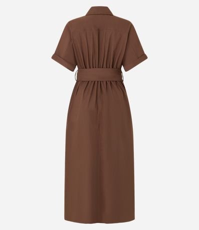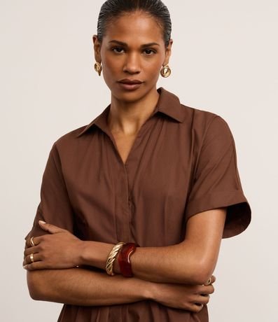 Vestido chemise evasê de mangas curtas com dobras, confeccionado em tricoline, com colarinho na gola. Inclui cinto faixa na cintura com fivela metalizada de meia lua. Este produto possui algodão certificado BCI em sua composição, além de ter sido produzido através de processos mais sustentáveis com boas práticas ambientais, sendo ambientalmente mais responsável.