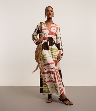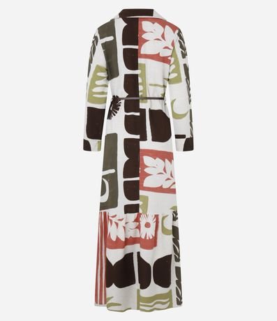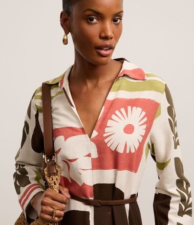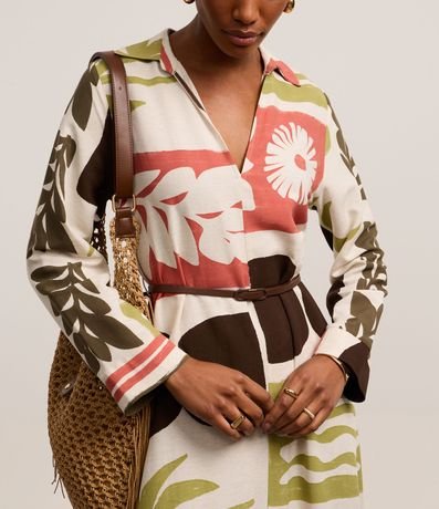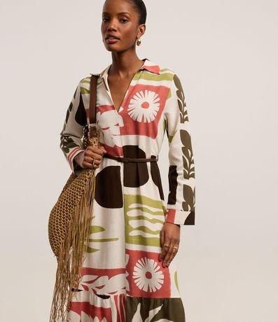 Vestido chemise evasê de comprimento midi e estrutura alfaiatada, confeccionado em viscolinho, com gola V e colarinho na gola. Conta com mangas longas e estampa com blocos e ícones em estilo que remetem a pinturas xilográficas. Inclui cinto fino com fivela. Este produto possui fio reciclado nos padrões ISO 14001 em sua composição, sendo ambientalmente mais responsável.