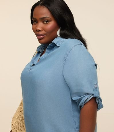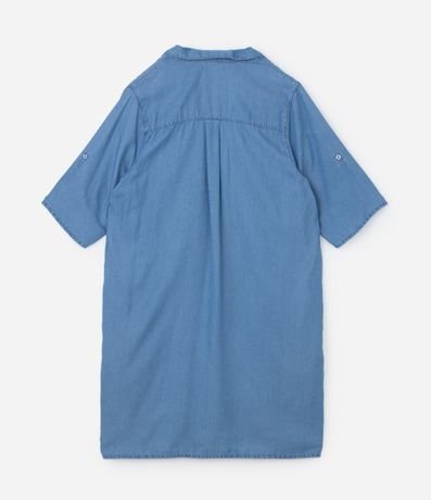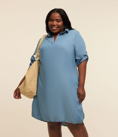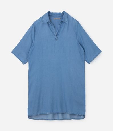 Ref: Vestido chemise curto, confeccionado em jeans leve, com gola V lapela, mangas 3/4 com regulagem e caimento levinho.