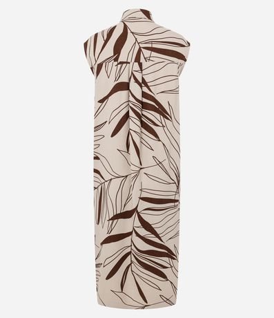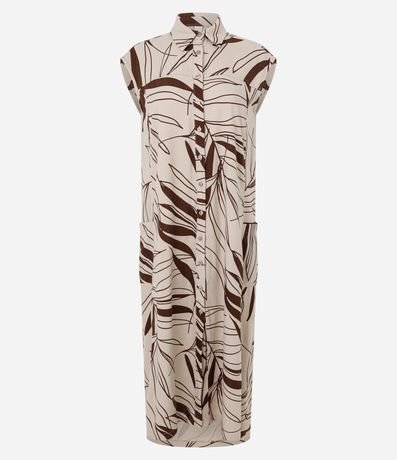 Ref: Vestido chemise longo, sem mangas, confeccionado em viscolinho com 30% de linho, com colarinho na gola e estampa de folhagens. Este produto possui material mais sustentável em sua composição, sendo ambientalmente mais responsável.