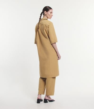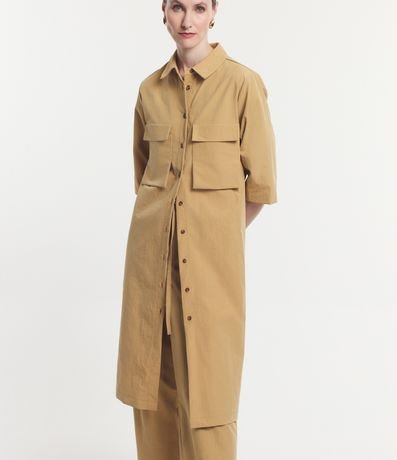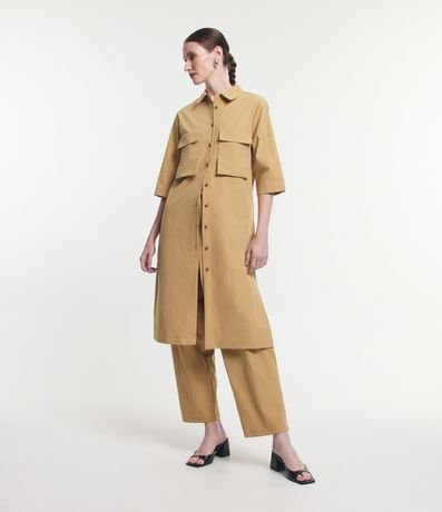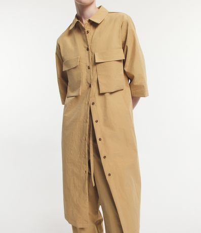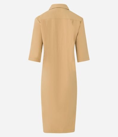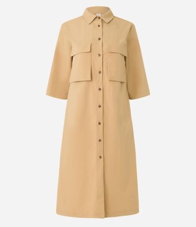 Ref: Vestido médio, com gola lapela, abotoamento frontal e bolsos grandes.