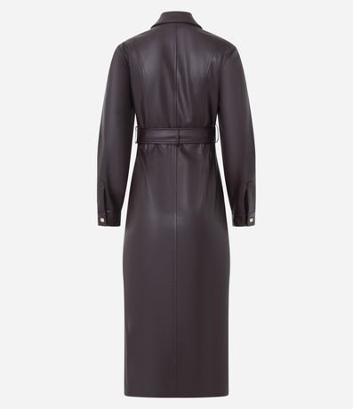 Ref: Vestido feminino midi confeccionado em PU. Possui modelagem chemise, fechamento frontal por botões, gola estruturada, mangas longas, cinto ajustável com fivela metálica e costura central nas costas.