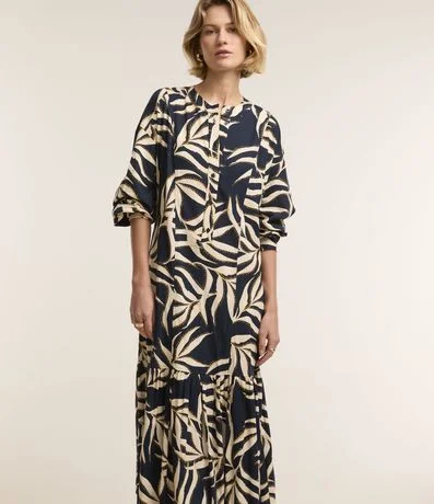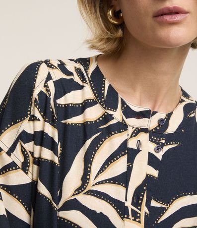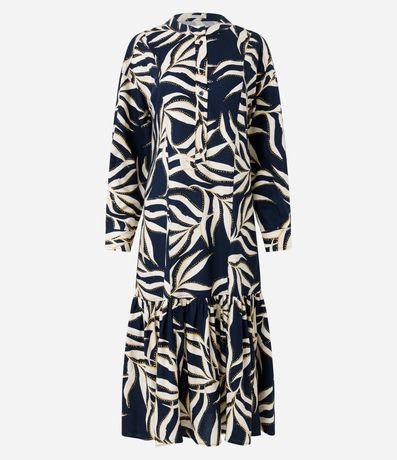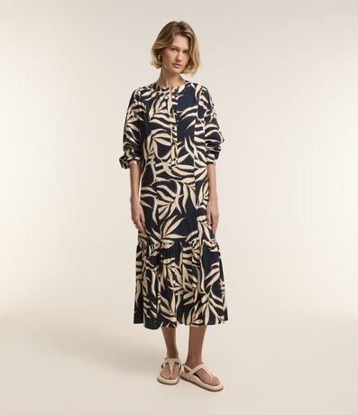 Ref: Vestido chemise midi manga 3/4 em viscolinho com estampa folhagem e decote v.