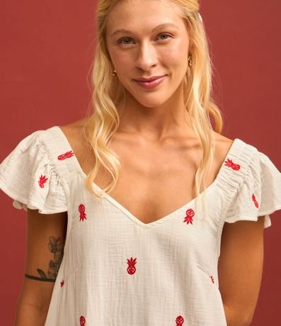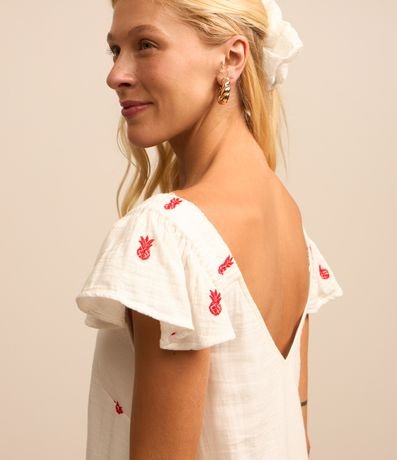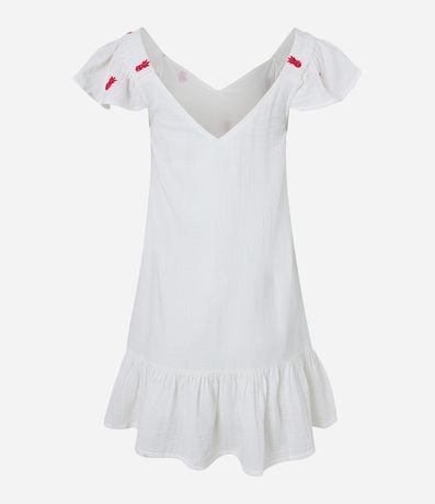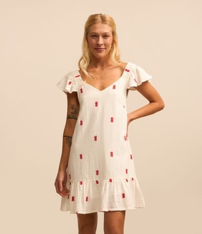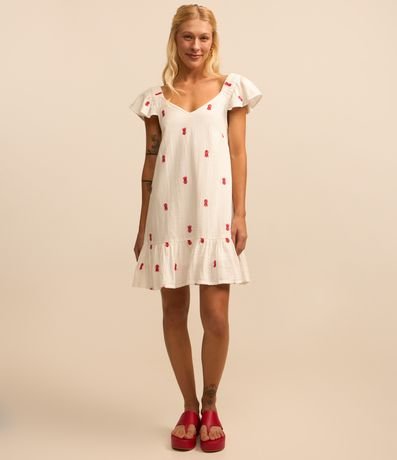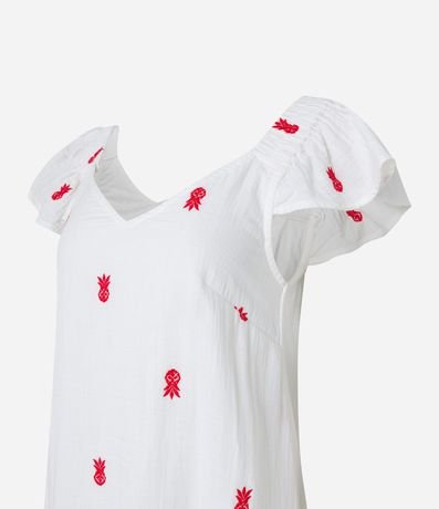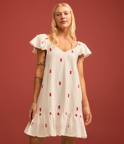 Ref: Vestido feminino com gola V, mangas curtas e babadinho na barra. Possui bordados de abacaxi.