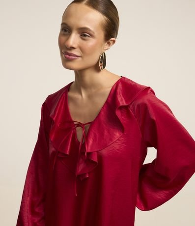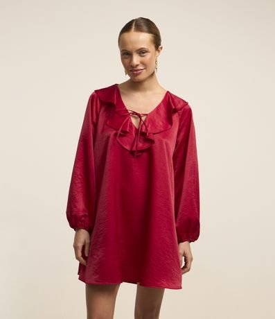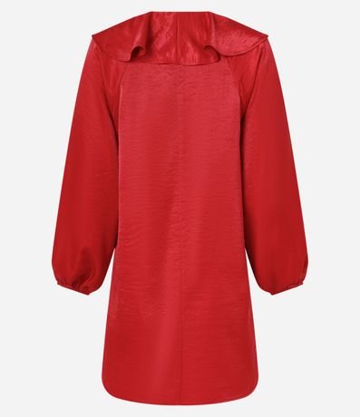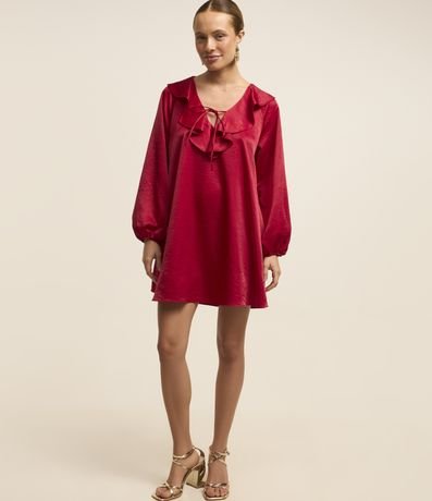Ref: Vestido curto com manga longa bufante, gola com babado e amarração, elástico nos punhos e com textura acetinada.