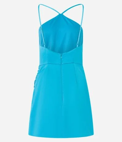 Vestido curto com alcinhas finas, decote halter, textura acetinada e com saia transpassada.