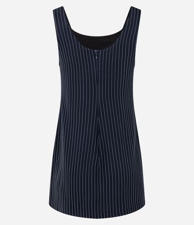 Vestido de comprimento curto e estrutura alfaiatada, sem mangas, com alças largas, decote quadrado e fechamento por zíper nas costas. A peça tem listras verticais em estilo riscas de giz.