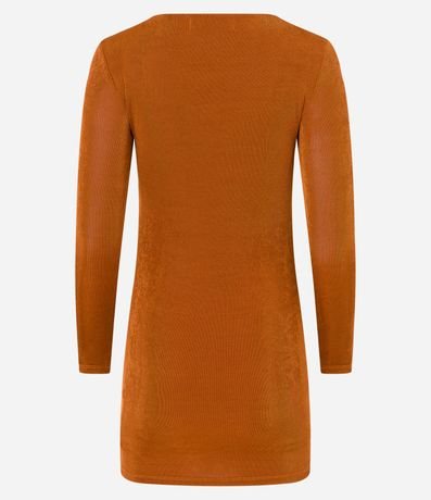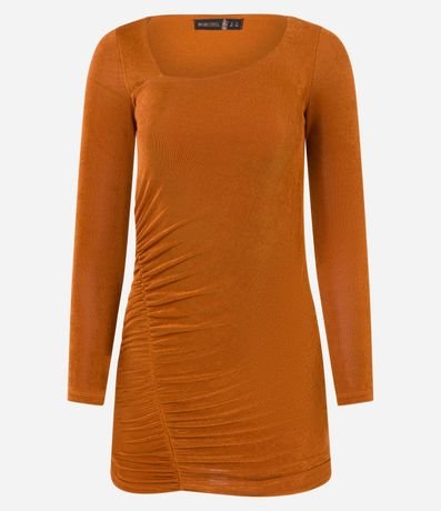 Vestido feminino de modelo curto, confeccionado em poliéster com elastano, com decote assimétrico e mangas longas. Sem estampa, possui texturinha e detalhe de franzido no corpo.