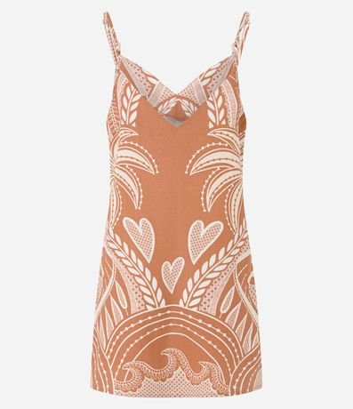 Vestido curto confeccionado com viscose certificada e linho. A peça tem alças finas reguláveis, detalhe de argola nas alças, decote V e estampa tropical com coqueiros e corações.