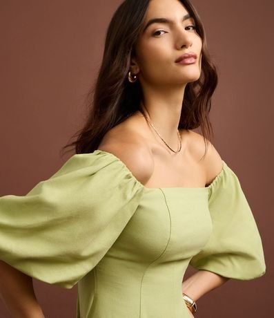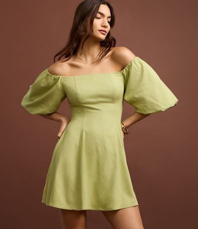 Ref: Vestido curto confeccionado em viscolinho, com decote ombro a ombro e mangas bufantes que conferem volume e charme ao visual. Modelagem evasê que valoriza a silhueta, ideal para looks femininos e sofisticados. Peça confeccionada em viscose certificada.