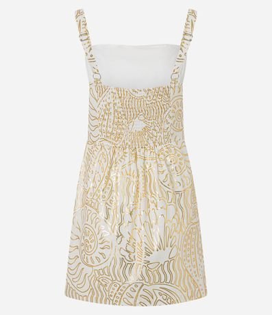 Ref: Vestido curto, sem mangas, confeccionado em viscolinho, com decote quadrado, abertura abaixo do busto e estampa abstrata de foil. Este produto possui viscose certificada em sua composição, sendo ambientalmente mais responsável.