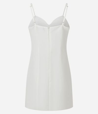 Vestido curto com decote coração profundo, em alfaiataria com recorte frontal e fechamento por zíper nas costas.