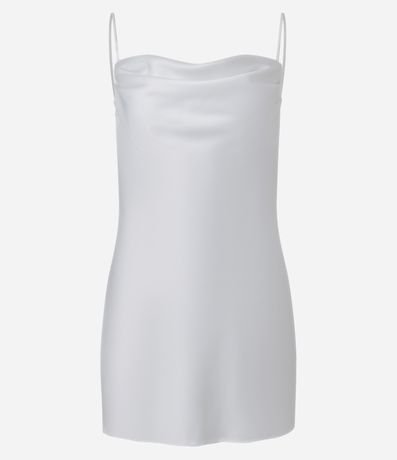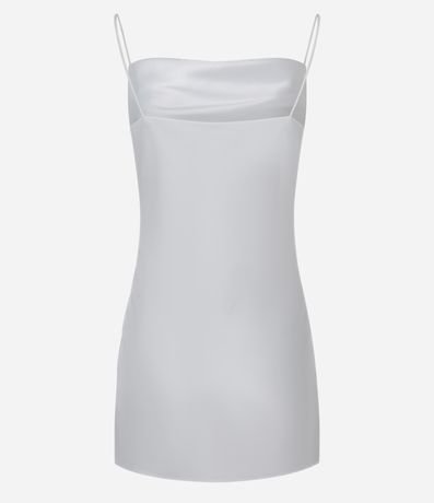 Vestido curto com alcinhas finas rabo de rato e decote com pregas, confeccionado em cetim sem estampas.