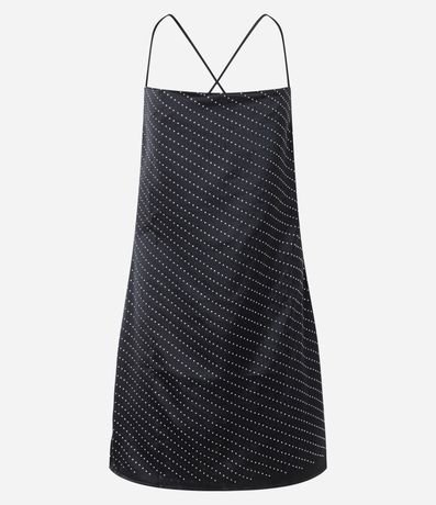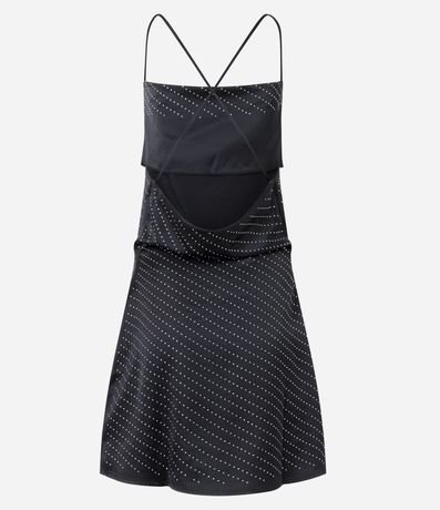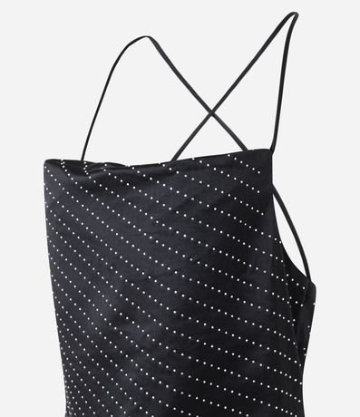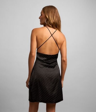 Vestido curto com alcinhas finas cruzadas nas costas, confeccionado em cetim com decote degagê e brilhos aplicados.
