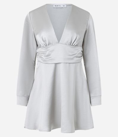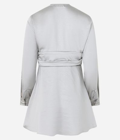Vestido curto com decote V com mangas longas e botões nos punhos, faixa na cintura.