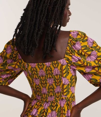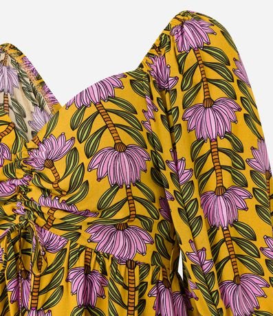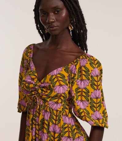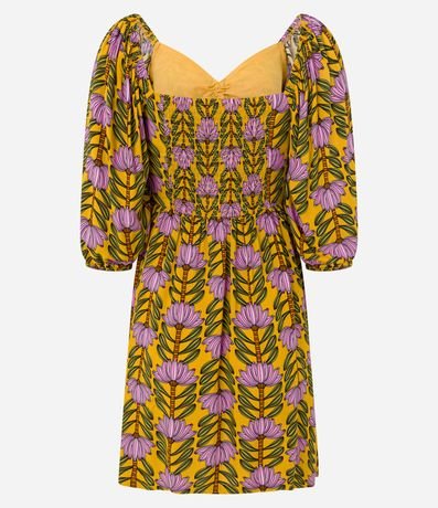 Ref: Vestido curto evasê confeccionado em chalis de viscose certificada. A peça tem decote V, busto franzido, mangas bufantes, lastex nas costas e estampa de bananeira.