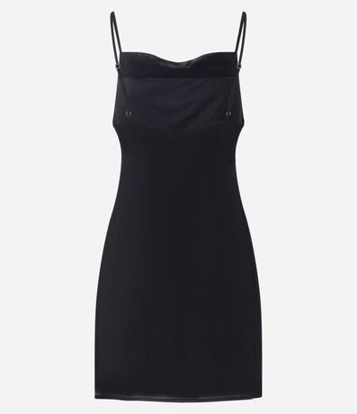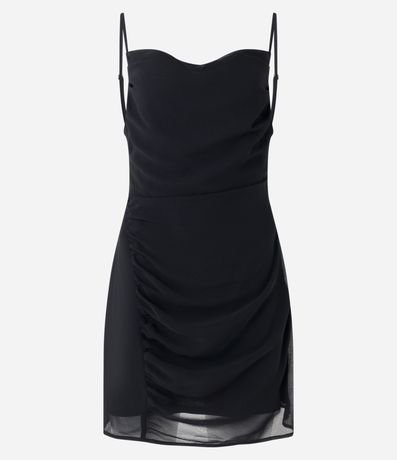 Vestidinho curto com alcinhas finas, decote degagê e franzido lateral assimétrico.