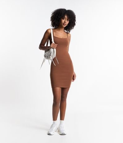 Vestido curto, confeccionado em cotton, com alças finas e decote reto.