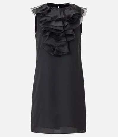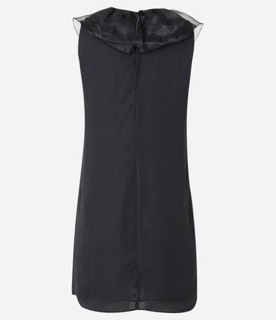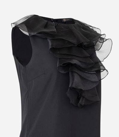 Ref: Vestido curto em crepe, sem mangas e sem estampa, com detalhe de babado frontal em organza e fechamento com botão nas costas.