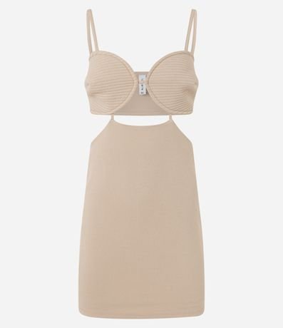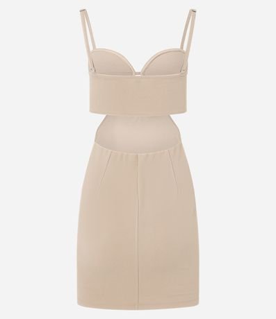 Vestido feminina confeccionada em crepe, no modelo curto com decote redondo, alças finas e recortes.