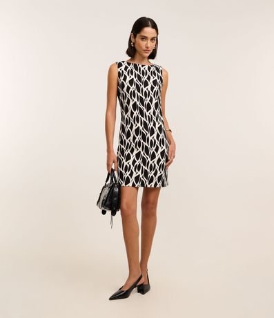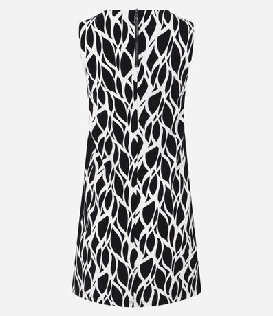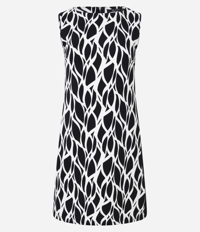 Ref: Vestido de comprimento acima dos joelhos, confeccionado em crepe, com gola redonda e sem mangas. Possui fechamento dianteiro na gola e estamparia abstrata que remetem a folhagens.
