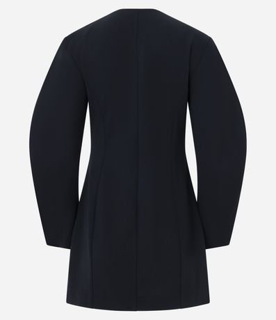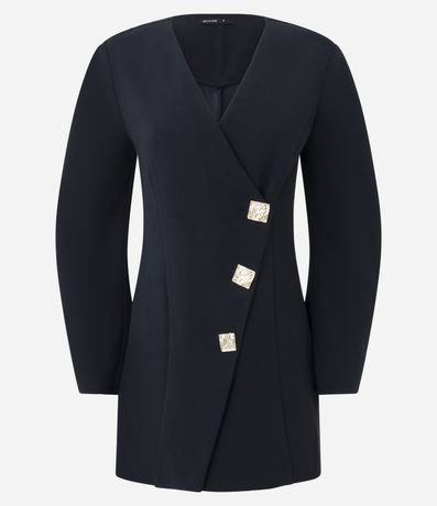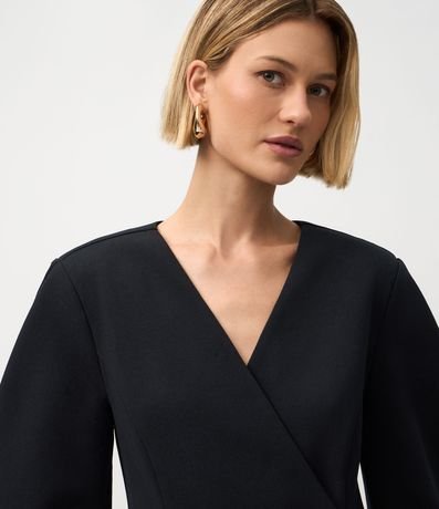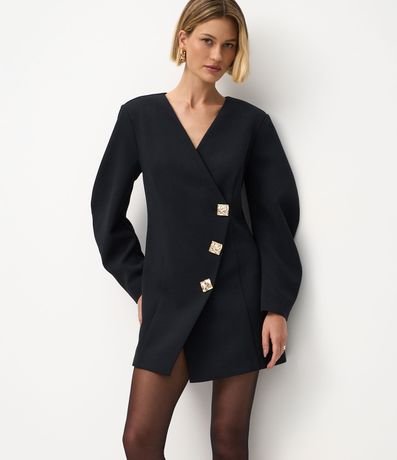 Ref: Vestido feminino curto em malha crepe, com estrutura firme e caimento alinhado. A frente traz recorte transpassado com três botões metálicos quadrados aplicados. As mangas são super amplas e longas, criando volume contrastante.