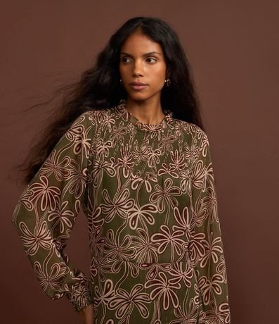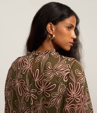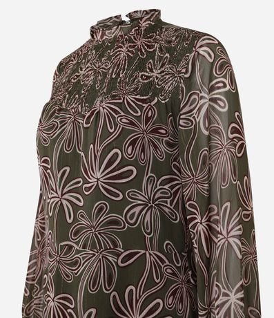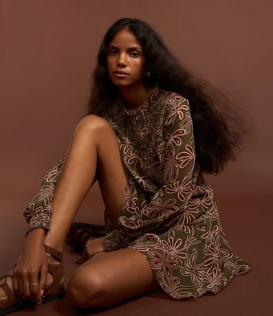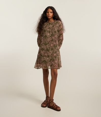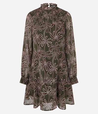 Vestido curto com manga longa, golinha alta, confeccionado em crepe georgette e estampa de tulipas.