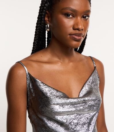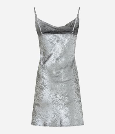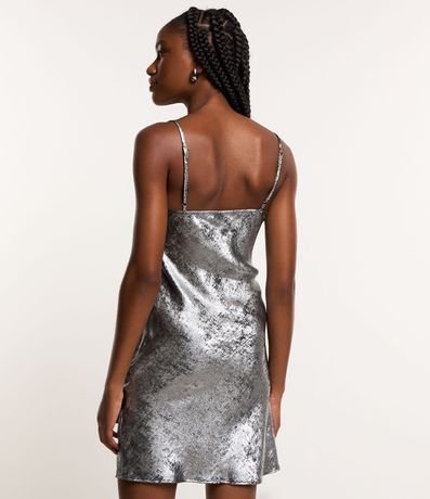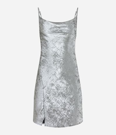 Vestido curto, alcinhas finas, decote degagê, metalizado e com botões forrados na lateral.