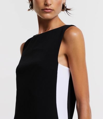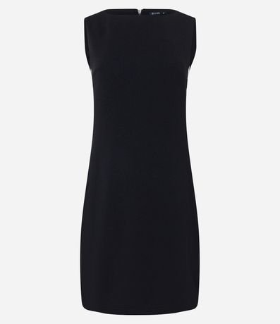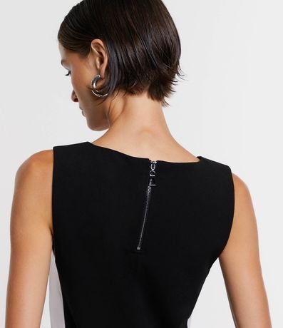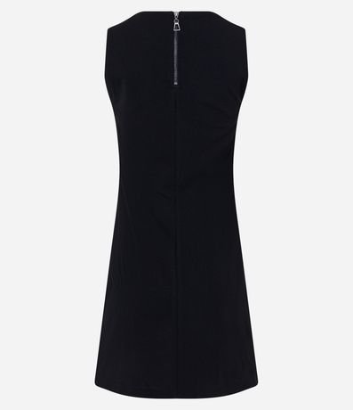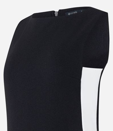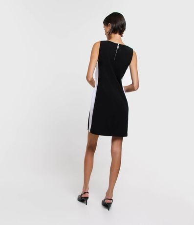 Ref: Vestido curto em crepe com gola redonda, sem manga, fechamento nas costas por zíper e detalhe contrastante nas laterais.