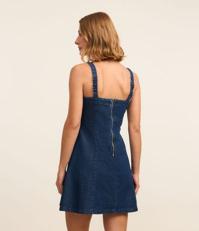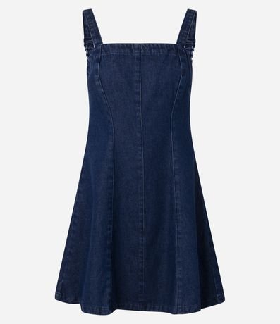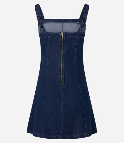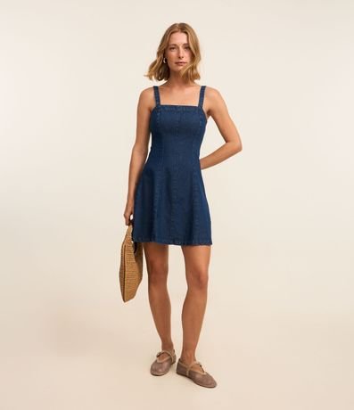 Ref: Vestido curto feminino confeccionado em jeans de algodão certificado bci, peça com decote reto, alças médias e fechamento por zíper nas costas.