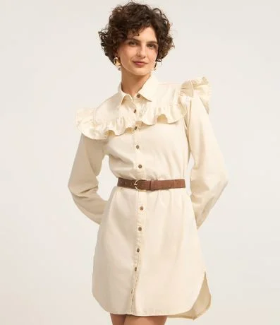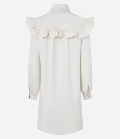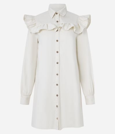 Ref: Vestido curto confeccionado em jeans com algodão mais sustentável, babado nos ombros e costas com abotoamento frontal e nos punhos.