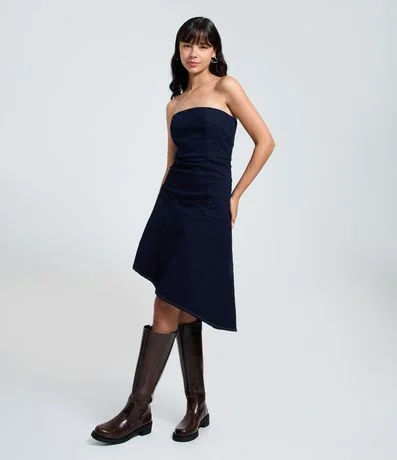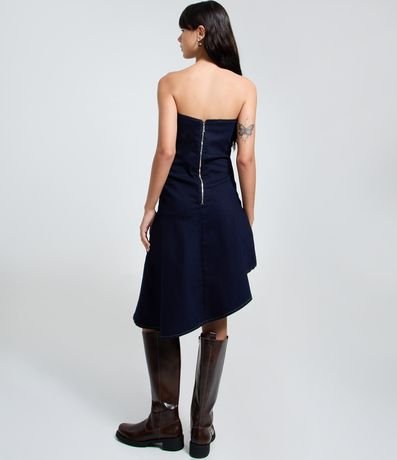 Ref: Vestido feminino confeccionado em jeans com algodão certificado BCI e boas práticas ambientais, modelo curto tomara que caia, barra assimétrica e zíper nas costas. Perfeito para looks modernos e versáteis.