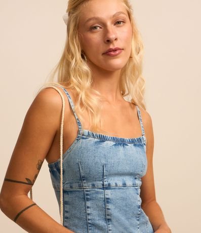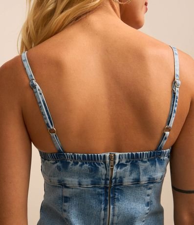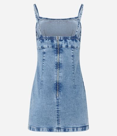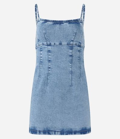 Ref: Vestido curto com alcinhas finas, fechamento por zíper nas costas, confeccionado em jeans com lavagem dirty.