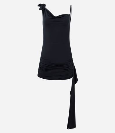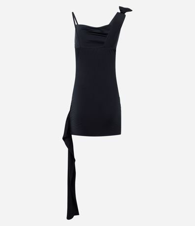 Vestido curto com alças assimétricas, amarração no ombro, confeccionado em jersey e tira lateral.