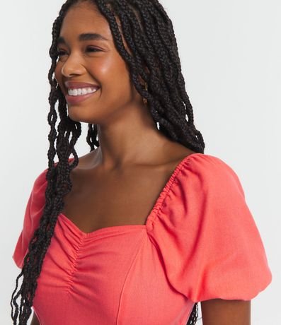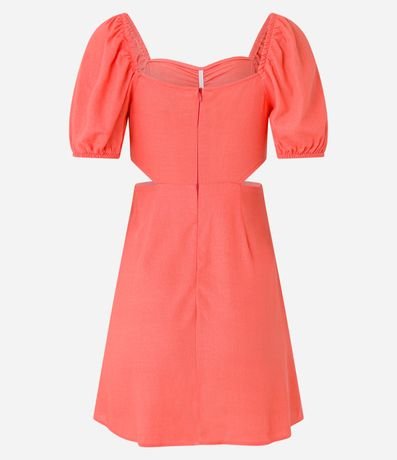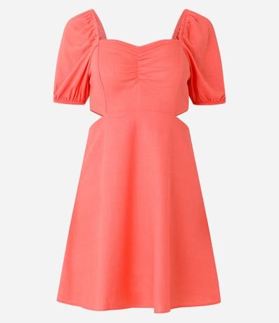 Ref: Vestido curto, confeccionado em linho, manga curta bufante, franzidinho no busto e recortes vazados nas laterais.