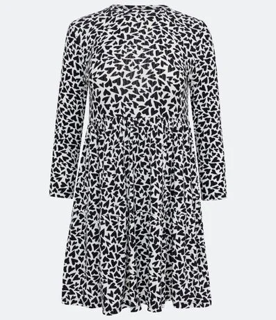Ref: Vestido curto em ribana com mangas 3/4 e elástico na cintura. Seu diferencial se dá pela estampa de corações e pelos franzidos na saia.