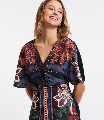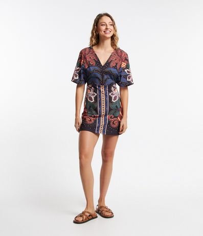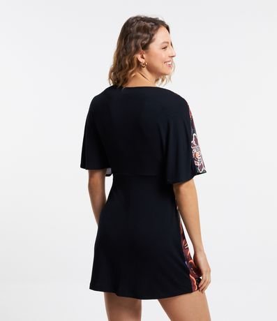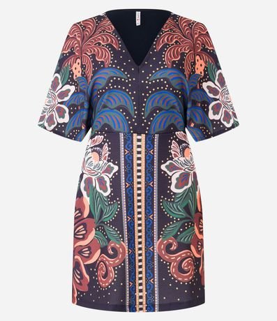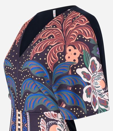 Ref: Vestido de modelo curto, confeccionado em malha de viscose mais responsável, com decote V e mangas curtas. Possui estampa apenas na parte frontal com tema tropical, de flores e coqueiros.