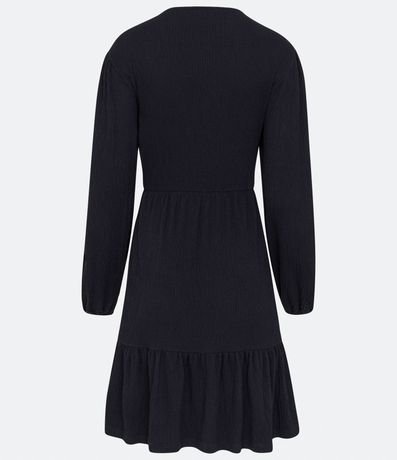 Ref: Vestido curto em malha texturizada com decote V, manga longa, babados na barra e sem estampa. Perfeito para você compor com aquela bota e arrasar no visual!