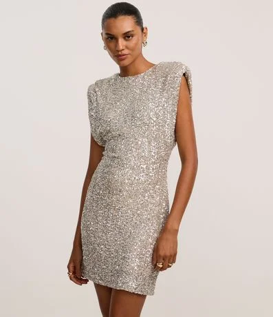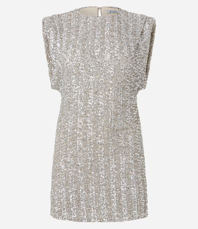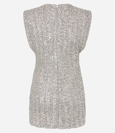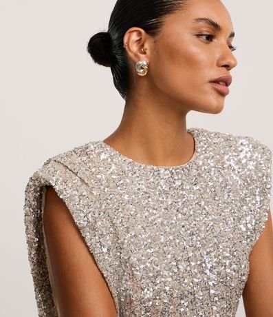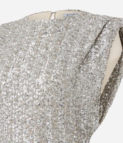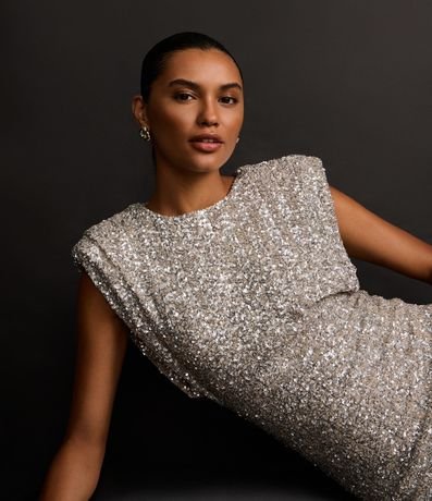 Ref: Vestido festivo confeccionado em paetê miúdo. A peça tem gola redonda, fechamento nas costas e ombreiras.