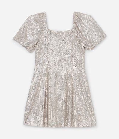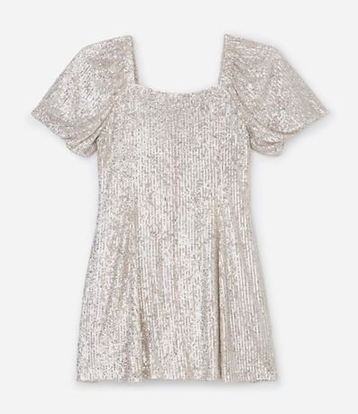 Ref: Vestido de paetê com mangas curtas e decote quadrado.