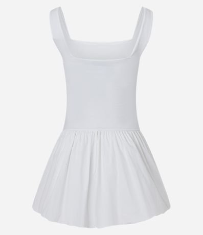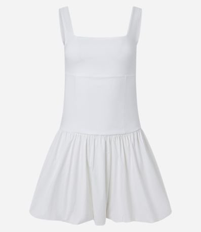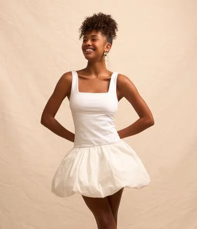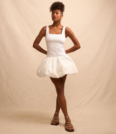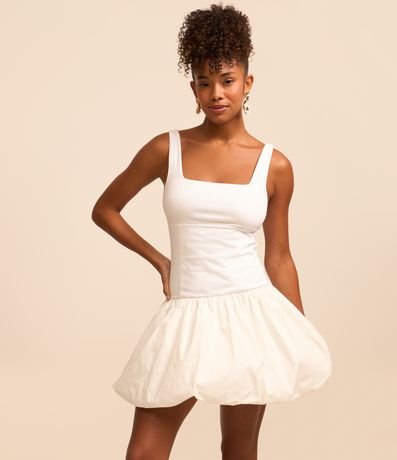 Ref: Vestido curto com saia balonê, alças largas, confeccionado em ponto roma e sem estampa.