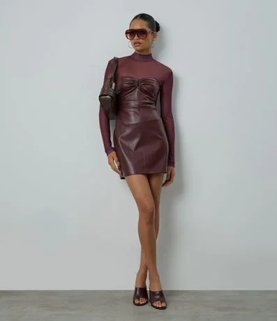 Ref: Vestido curto em PU com decote franzido que valoriza o busto e modelagem ajustada. Possui estrutura firme, acabamento moderno e visual marcante, ideal para produções noturnas. Uma peça versátil para compor looks poderosos e cheios de personalidade em momentos especiais.