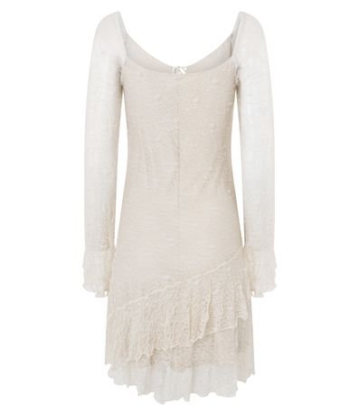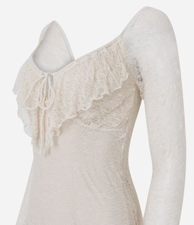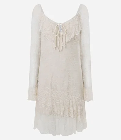 Vestido curto em renda com mangas longas e decote em V, trazendo um visual delicado e elegante. Possui babado no busto e na barra assimétrica, além de caimento leve que valoriza a silhueta. Peça perfeita para compor produções femininas e modernas.